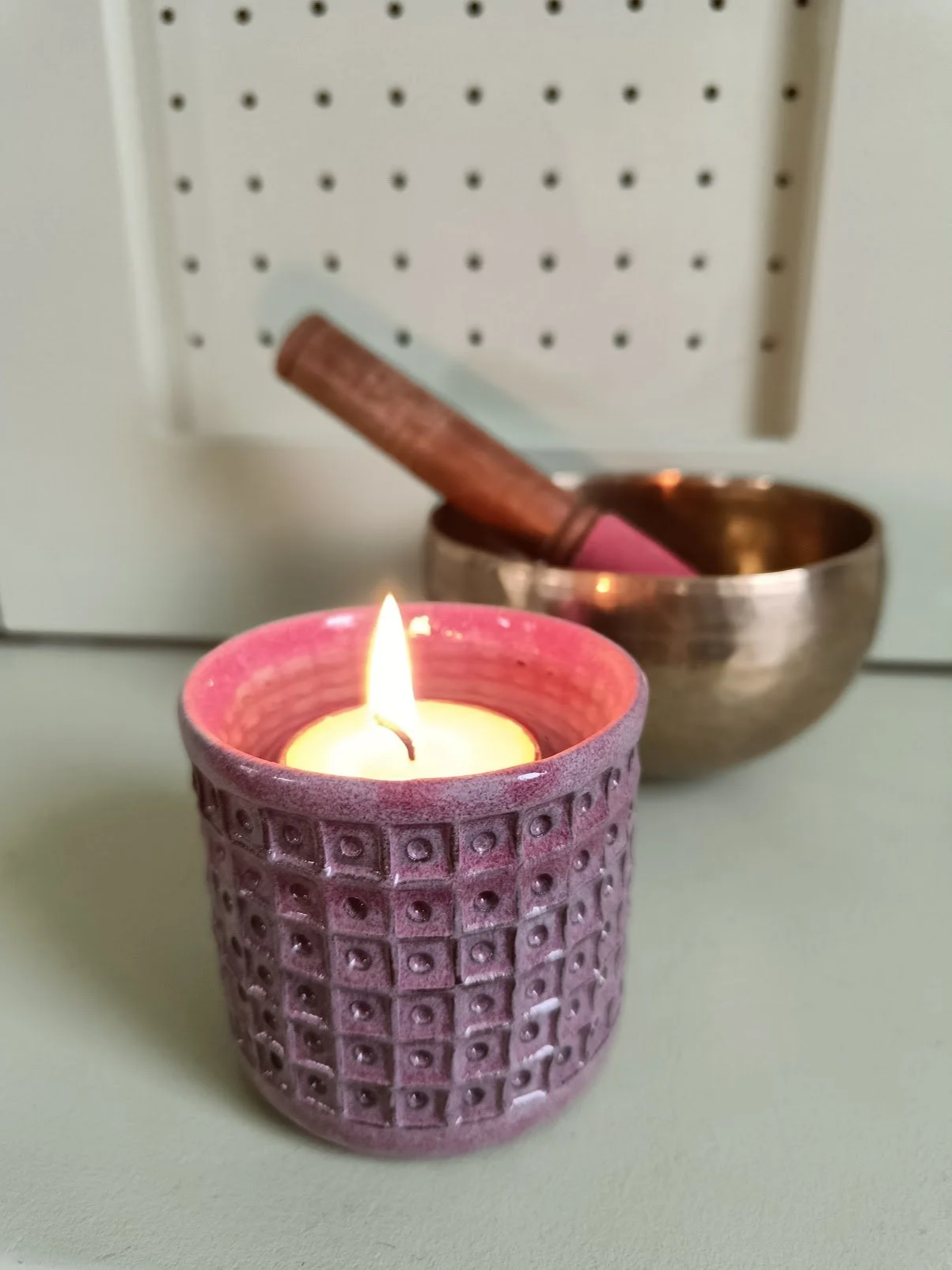 Une bougie dans un pot de la collection Quartz rose prolonge la lumière. À proximité, un bol tibétain peut être mis en vibration, ou simplement laissé là.